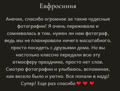 Сохраню ценные воспоминания для вашей семьи — от истории знакомства и свадьбы до семейных и детских фотосессий, а так же возьму на себя праздники и мероприятия вашей семьи и ваших детей в школе и детском саду.